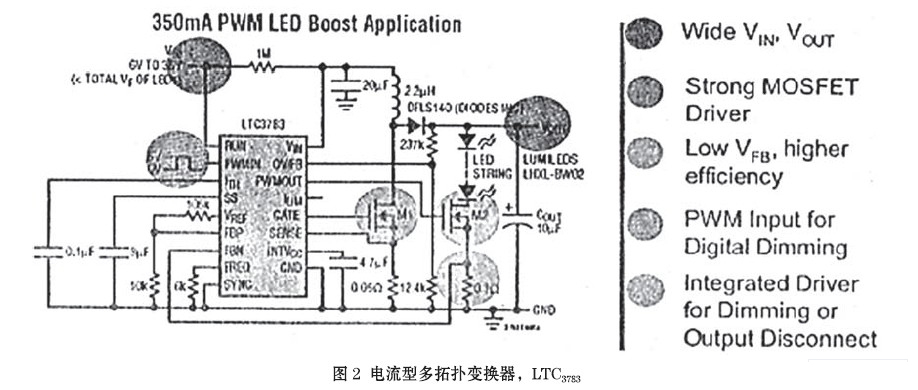 LTC3783是帶恒流PWM調(diào)光的電流型多拓撲變換器(圖2),用于驅動大功率LED燈串。本項專利技術可提供非??於鴾蚀_的負載切換,不會產(chǎn)生瞬時的欠電壓或過電壓,能數(shù)字式達到3000∶1的調(diào)光率(100Hz),純色的PWM調(diào)光可確保白色LED和紅綠藍(RGB) LED的顏色完整性。LTC3783利用模擬控制,容許附加100∶1的調(diào)光比,因人眼對周圍光線的變化很敏感,故這一比率必不可少。該多功能的控制器可用于升壓、降壓、升降壓雙向變換器或反激式(Flyback)變換器,或作為恒流/恒壓的調(diào)節(jié)器。利用MOSFET的通態(tài)電阻(on-resistance)可取消傳感電流的電阻器,并提高了效率。LTC3783芯片的應用還包括:高電壓LED陣列和LED背光,以及在電訊、自動化與工業(yè)控制系統(tǒng)中的調(diào)節(jié)器。