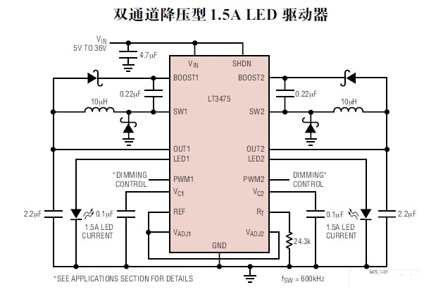 LTC3475以其寬的輸入電壓范圍(4V~36V,max40V),可調(diào)節(jié)含汽車動力系統(tǒng)在內(nèi)的廣闊的電源陣列。它的開關頻率調(diào)節(jié)幅度為200kHz~2MHz,能利用很小的電感器和陶瓷電容器,與耐熱的TSSOP-16組件結合,在驅動2個或4個大電流LED時,可提供結構非常緊湊的解決方案。