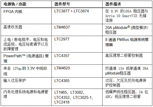 表 1 概述了圖 1 所示 Arria 10 開發(fā)套件電路板的電源軌和功能。該表列出了凌力爾特公司的器件,并描述了每種器件的功能。訪問 www.linear.com.cn/altera,點(diǎn)擊 Arria,了解本文所示兩種電路板的詳細(xì)技術(shù)信息。