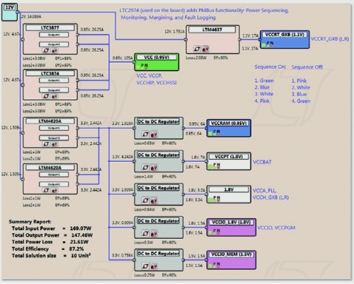 圖 3:用于 Arria 10 GX FPGA 電路板 (圖 1) 的電源樹。用 LTpowerPlanner 設(shè)計,該軟件是一款分析性和簡便易用的初步設(shè)計工具以用來映射電源要求。