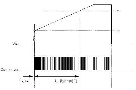 電源的軟啟動對降低場效應(yīng)管和輸出二極管的尖峰電壓和尖峰電流有很大幫助,從而降低了其電壓應(yīng)力和電流應(yīng)力。但是對于LLC諧振電源來說,軟啟動對電源起機的可靠性非常關(guān)鍵;因為LLC電源的IC是通過高頻掃描的方式啟動的。如圖 3所示在IC啟動時驅(qū)動PWM頻率會從設(shè)定的最高頻率開始慢慢恢復(fù)正常頻率,恢復(fù)時間也就是軟啟動時間。在此期間電源工作在不穩(wěn)定狀態(tài),軟啟動時間越長,啟動越安全;但軟啟動時間過長也會對電源帶容性負(fù)載能力和起機時間造成影響。