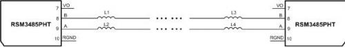 如圖 4所示的電路,兩個(gè)RSM3485PHT模塊AB接口分別串聯(lián)了磁珠,能夠達(dá)到IEC 61000-4-4 ±4kV,并能夠有效降低通信誤碼率,僅在電路中串聯(lián)了磁珠,非常的便宜有效,如果要求的EFT抗擾度等級(jí)更高,那么可以適當(dāng)增加磁珠的數(shù)量。