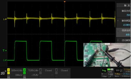 圖3 CH1使用夾子測(cè)量電源輸出,CH2使用夾子測(cè)量電感,單點(diǎn)接地
