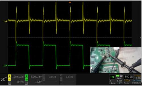 圖5 CH1使用接地彈簧測(cè)量電源輸出,CH2使用夾子測(cè)量電感,各自接地