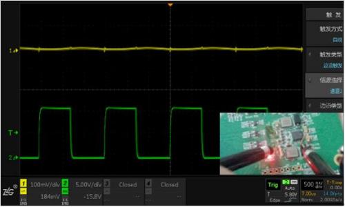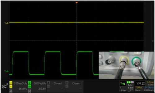 測(cè)試方法:通道1測(cè)量小信號(hào)(100mv/div),通道2測(cè)量大信號(hào)(5V/div),觀察信號(hào)互相影響的情況。