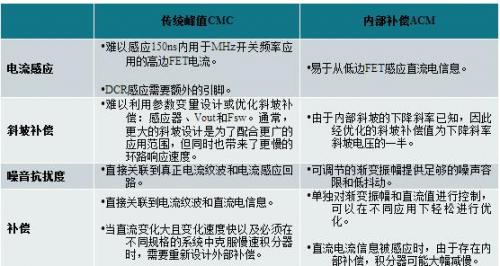 表1顯示了傳統(tǒng)峰值電流模式和內(nèi)部補(bǔ)償ACM的比較: