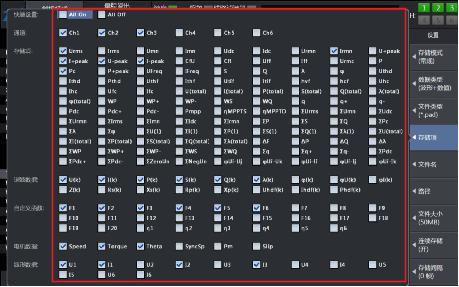 第五,存儲項是設置中最關(guān)鍵的一步,點開存儲項菜單后,會看到功率分析儀所能分析記錄的所有數(shù)據(jù),我們根據(jù)自己的需要進行勾選對應通道和參數(shù),只有完成存儲項的設置,才能記錄對應的數(shù)據(jù);