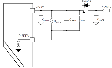從上圖我們可以看到,所需要的外部器件很少。該芯片還提供一個單獨的 pin 腳 DIS來驅動負載輸出端的外部 FET(P-FET),在設備關斷或者輸出短路時它能完全斷開輸入與輸出的連接。啟動時,通過內(nèi)部電流源來控制外部 P-FET 開關。在關斷或者輸出短路時,將輸出與輸入側隔離,如下圖: