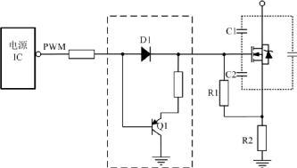 如果選擇MOS管寄生電容比較大,電源IC內(nèi)部的驅(qū)動能力又不足時,需要在驅(qū)動電路上增強驅(qū)動能力,常使用圖騰柱電路增加電源IC驅(qū)動能力,其電路如圖 2虛線框所示。
