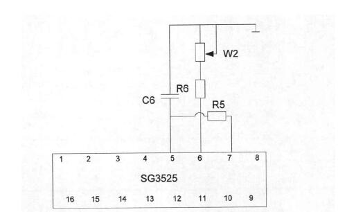 本文設計的模塊控制與驅(qū)動模塊,工作頻率是由芯片的腳、腳和腳外接的電阻與電容來確定。如圖所示,其中電阻和滑動變阻器組成,電容即為,為。根據(jù)計算公式可以知道