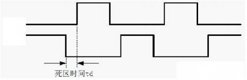 對于半橋、全橋和LLC諧振等一些H橋或半H橋的拓撲電源,PWM的死區(qū)時間設(shè)定對電源可靠性至關(guān)重要。實際上設(shè)定死區(qū)時間實則為了避免上、下管直通從而導(dǎo)致電源炸機,也就是說設(shè)定一段上、下管同時關(guān)斷的時間,在上管關(guān)斷后延遲一段時間再導(dǎo)通下管或在下管關(guān)斷后延遲一段時間再導(dǎo)通上管,如圖5所示td即為死區(qū)時間。