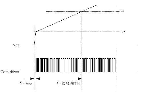 電源的軟啟動對降低場效應(yīng)管和輸出二極管的尖峰電壓和尖峰電流有很大幫助,從而降低了其電壓應(yīng)力和電流應(yīng)力。但是對于LLC諧振電源來說,軟啟動對電源起機的可靠性非常關(guān)鍵;因為LLC電源的IC是通過高頻掃描的方式啟動的。如圖6所示在IC啟動時驅(qū)動PWM頻率會從設(shè)定的最高頻率開始慢慢恢復(fù)正常頻率,恢復(fù)時間也就是軟啟動時間。在此期間電源工作在不穩(wěn)定狀態(tài),軟啟動時間越長,啟動越安全;但軟啟動時間過長也會對電源帶容性負載能力和起機時間造成影響。